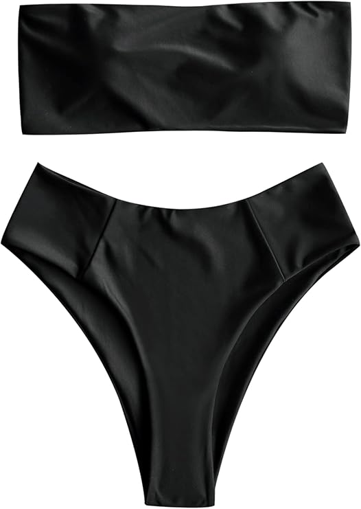 Bikini Set for Women Two Piece Swimsuit Bandeau Top Back Tie Mid Waisted Bottom with Removable Shoulder Straps