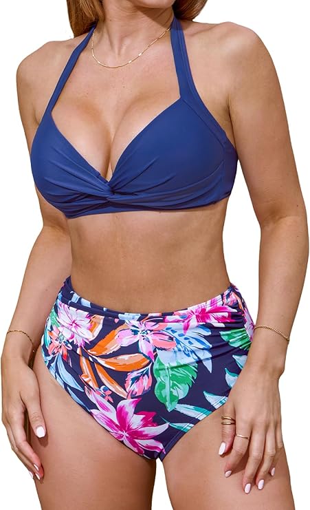 Women's High Waisted Bikini Sets Tummy Control Swimsuits 2024 Two Piece Bathing Suits Color Block Halter Swim Suits