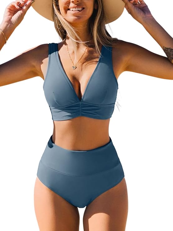 Bikini Set for Women Two Piece Swimsuit High Waisted V Neck Ruched Front Wide Straps