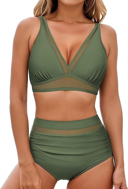 Women High Waisted Bikini Sets Two Piece Swimsuit for Women Tummy Control Mesh V Neck Bikini Swimsuits Bathing Suits