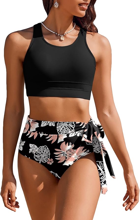 Women's Tummy Control High Waisted Bikini Set 2 Piece Side Knot Swimsuit Scoop Neck Bathing Suits