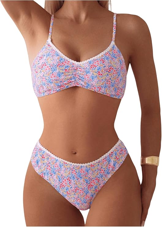 Women's Floral Print Bikini Set Lace Trim Swimsuit 2 Piece High Waisted Bathing Suit Beachwear