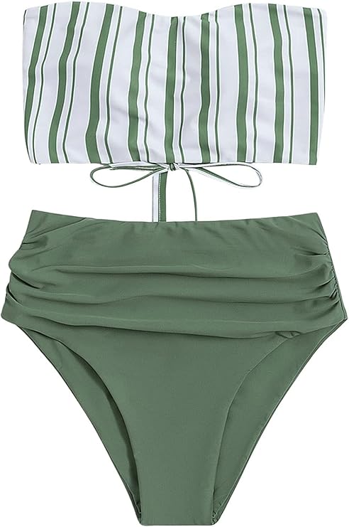 Women's Bathing Suits Striped Bandeau Bikini high Waisted Swimsuits Swimwear Set